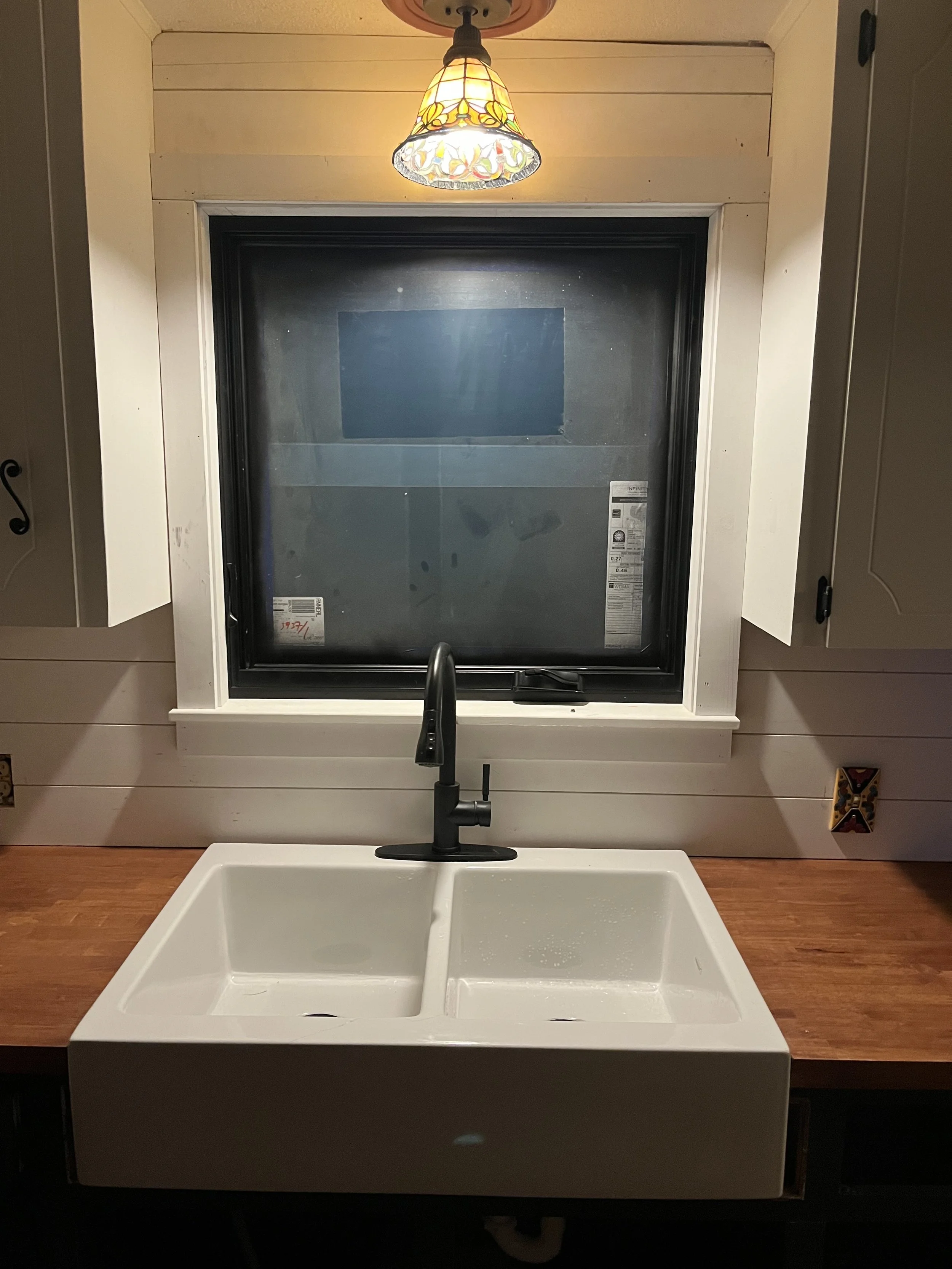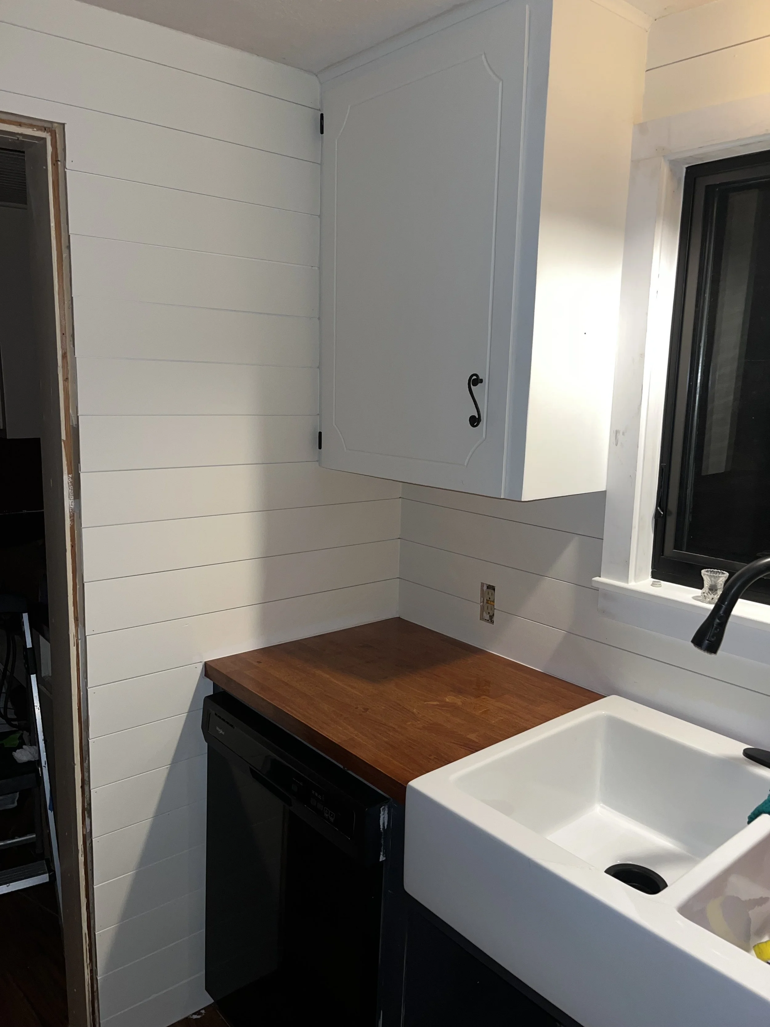 This kitchen upgrade is a perfect blend of style, function, and detail. We installed a striking farmhouse-style double basin sink, paired with a modern matte black faucet for a clean, updated look. The warm butcher block countertops provide natural texture and durability, bringing contrast and character to the space. Painted upper cabinets and shiplap walls add a classic, timeless touch—offering both visual warmth and dimensional depth. The custom trim and finishing work around the window frame out the space beautifully.
